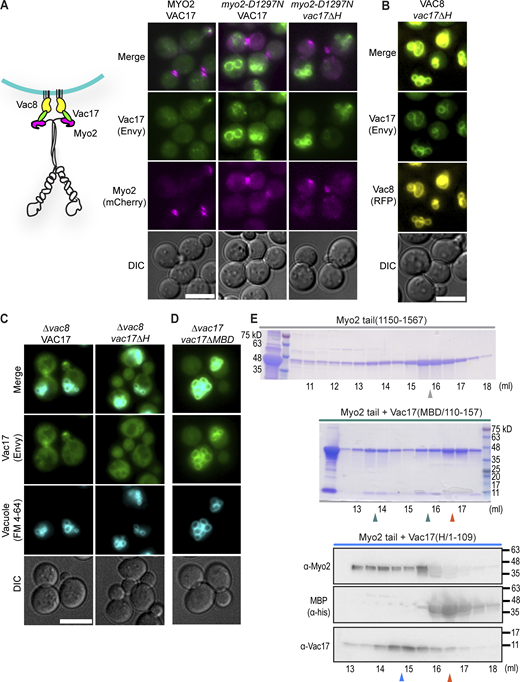 Based on the Vac17 mutant data, we hypothesized that Vac17(H) directly binds Myo2. To test this, we co-expressed and purified recombinant peptides of Vac17(H) or Vac17(MBD) with the Myo2 tail. Consistent with previous biochemical studies, Vac17(MBD) bound to the Myo2 tail (Fig. 1 E and Fig. S1 E, Eves et al., 2012; Liu et al., 2022; Tang et al., 2019). Notably, we observed that the Vac17(H) peptide exhibited affinity for the Myo2 tail. To confirm complex formation, we performed a reciprocal pull-down of Vac17 followed by Myo2. Subsequent gel filtration analysis (darker blue) revealed a peak corresponding to the expected Vac17(H)–Myo2 complex (lighter blue), verifying their interaction. These findings suggest that the partial inheritance defect observed in the vac17ΔH mutant results from a reduced ability of Vac17 to bind Myo2.